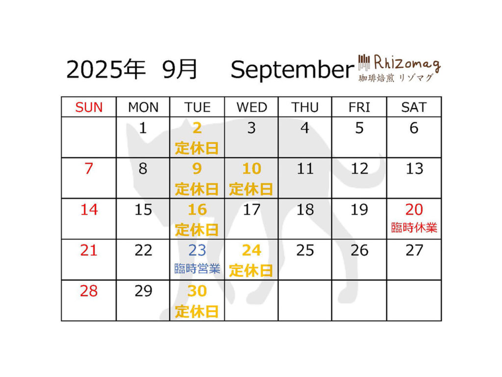 9月のカレンダーと臨時休業のお知らせ(9/20 土曜日) 2025 9/02 お知らせ 9月 2, 2025 9月 2, 2025 9月の営業カレンダーです。まだまだ暑い日が続いております。当店ではアイスコーヒーに加えひんやり冷たい オーガニック ベリーハーブティのテイクアウトも始めました、是非お試しください。臨時休業日につきまして誠に勝手ながら、9月20日(土)は臨時休業とさせて頂きます。ご不便をおかけしますが、どうぞよろしくお願いいたします。また、火曜日は定休日とさせて頂いておりますが9月23日(火)は臨時営業いたします。みなさまのご来店心よりお待ちしております。 お知らせ この記事が気に入ったら フォローしてね! Follow Me よかったらシェアしてね! URLをコピーしました! URLをコピーしました! 8月の営業カレンダー 臨時休業のお知らせ 関連記事 2月の営業カレンダーです。 2月 2, 2026 1月の営業カレンダーです。 1月 5, 2026 年末年始の営業日のお知らせです。 12月 19, 2025 12月の営業カレンダーです。 11月 30, 2025 11月の営業カレンダーです。 11月 2, 2025 10月の営業カレンダーと臨時休業のお知らせ(10/10 金曜日) 10月 1, 2025 臨時休業のお知らせ 9月 25, 2025 8月の営業カレンダー 8月 5, 2025 コメント コメントする コメントをキャンセルコメント ※ 名前 ※ メール ※ サイト 次回のコメントで使用するためブラウザーに自分の名前、メールアドレス、サイトを保存する。